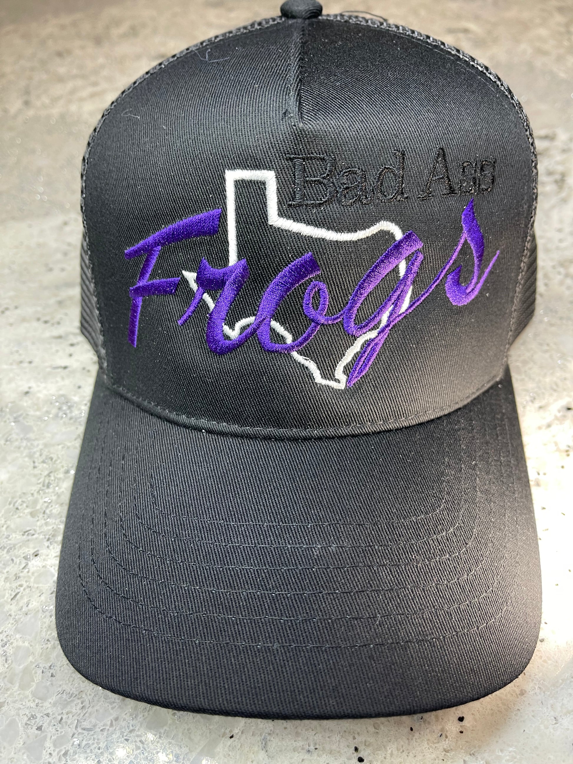 Bad Ass frogs trucker cap. If you would like this logo on a different hat just message us.