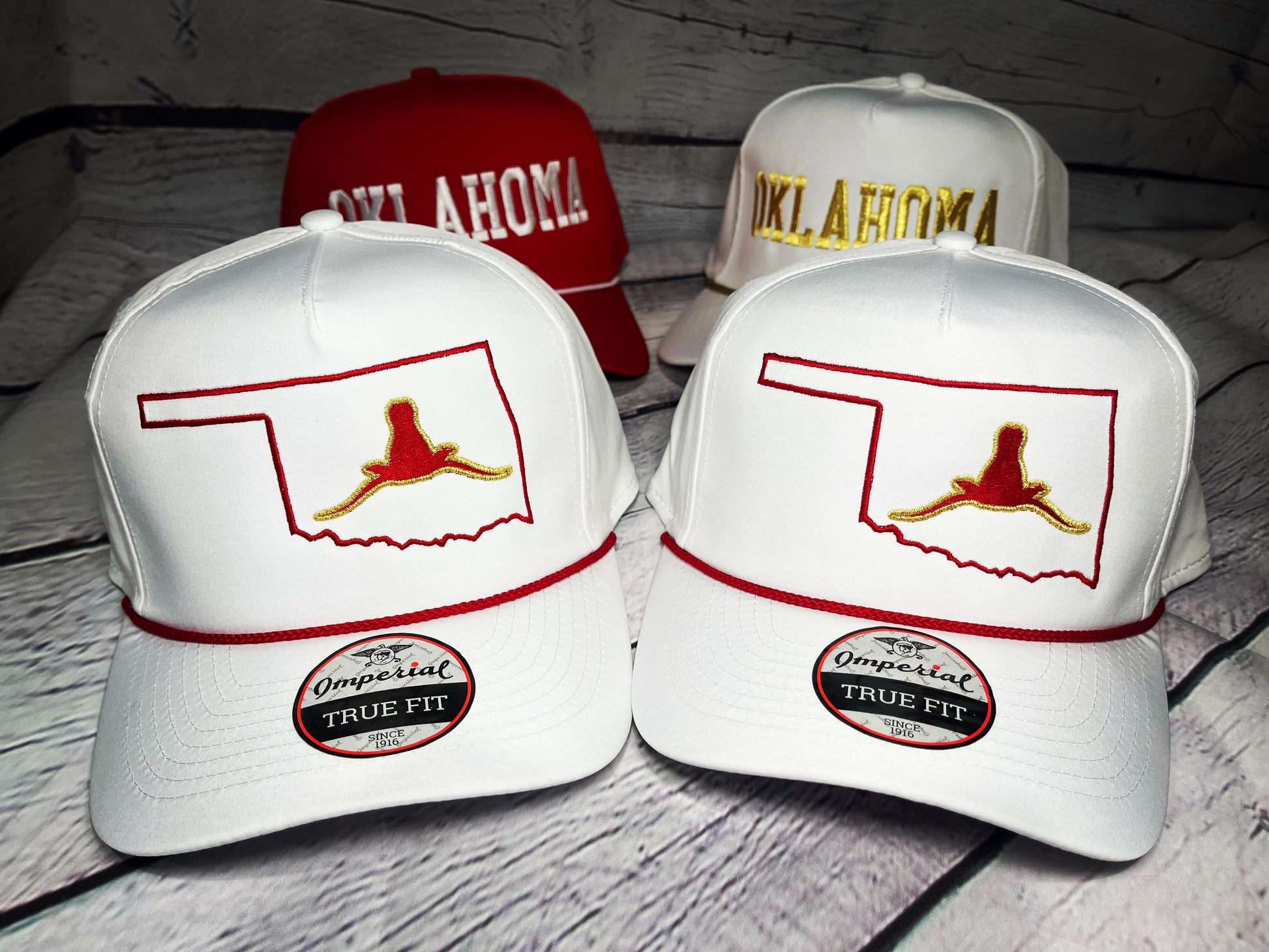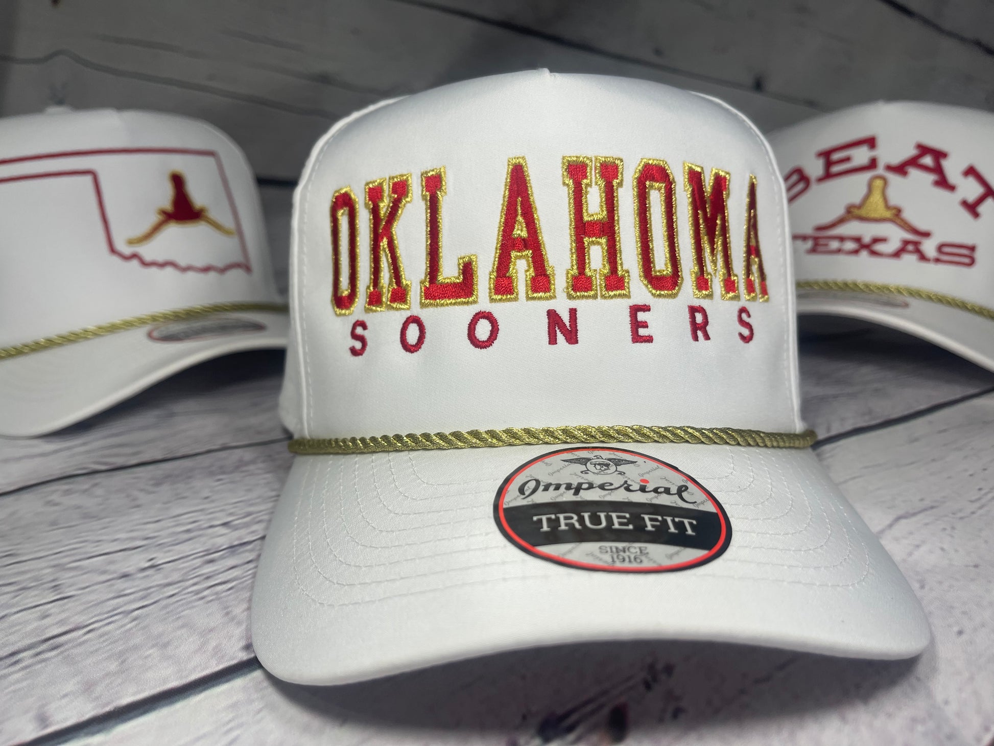 Beat Texas Oklahoma Sooners Horns Down Imperial gold series golf hat. This is a Imperial 5054 high crown hat with a gold rope. Boomer Sooner!